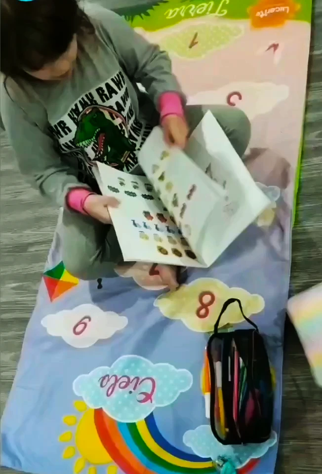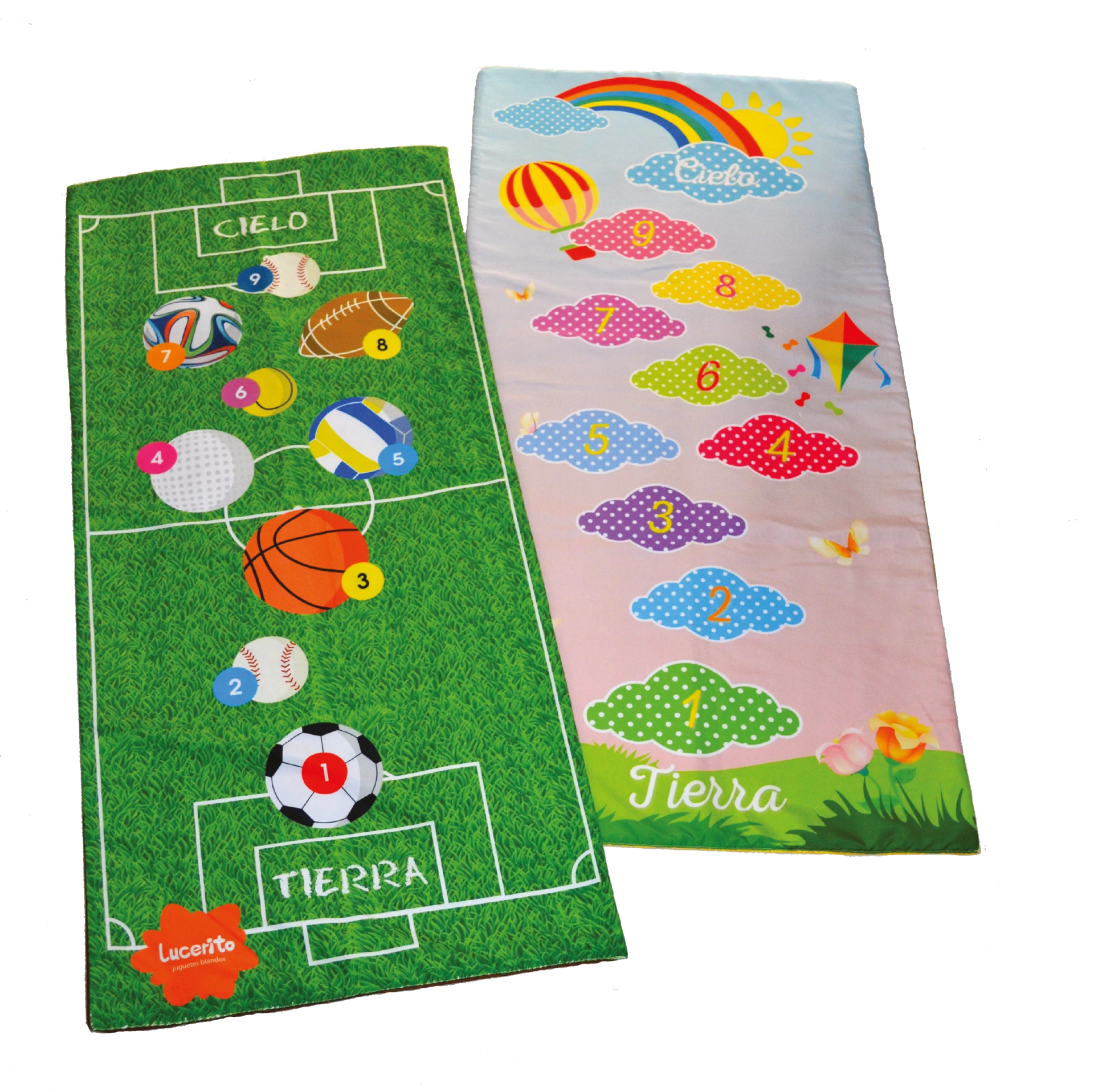 Alfombra rayuela con nubes y arco iris fabricada con microfibra estampada y base de jersey bondeado - medidas 1,40 por 0,75 cm.