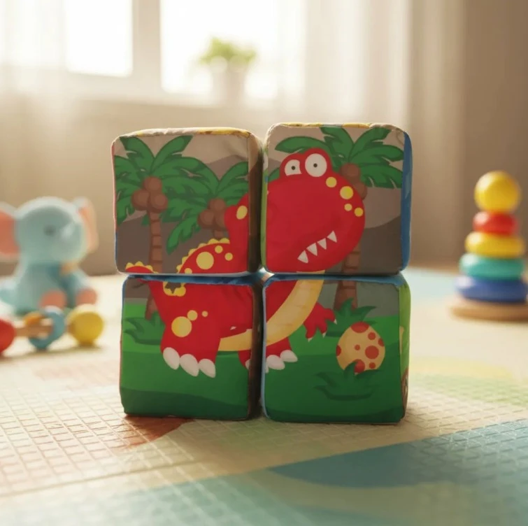 Rompecabezas de 4 cubos de 8x8 cm. con 6 rompecabezas para armar, fabricados en tela jersey de seda estampada,