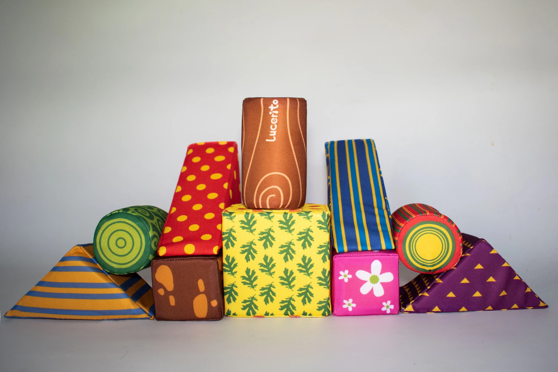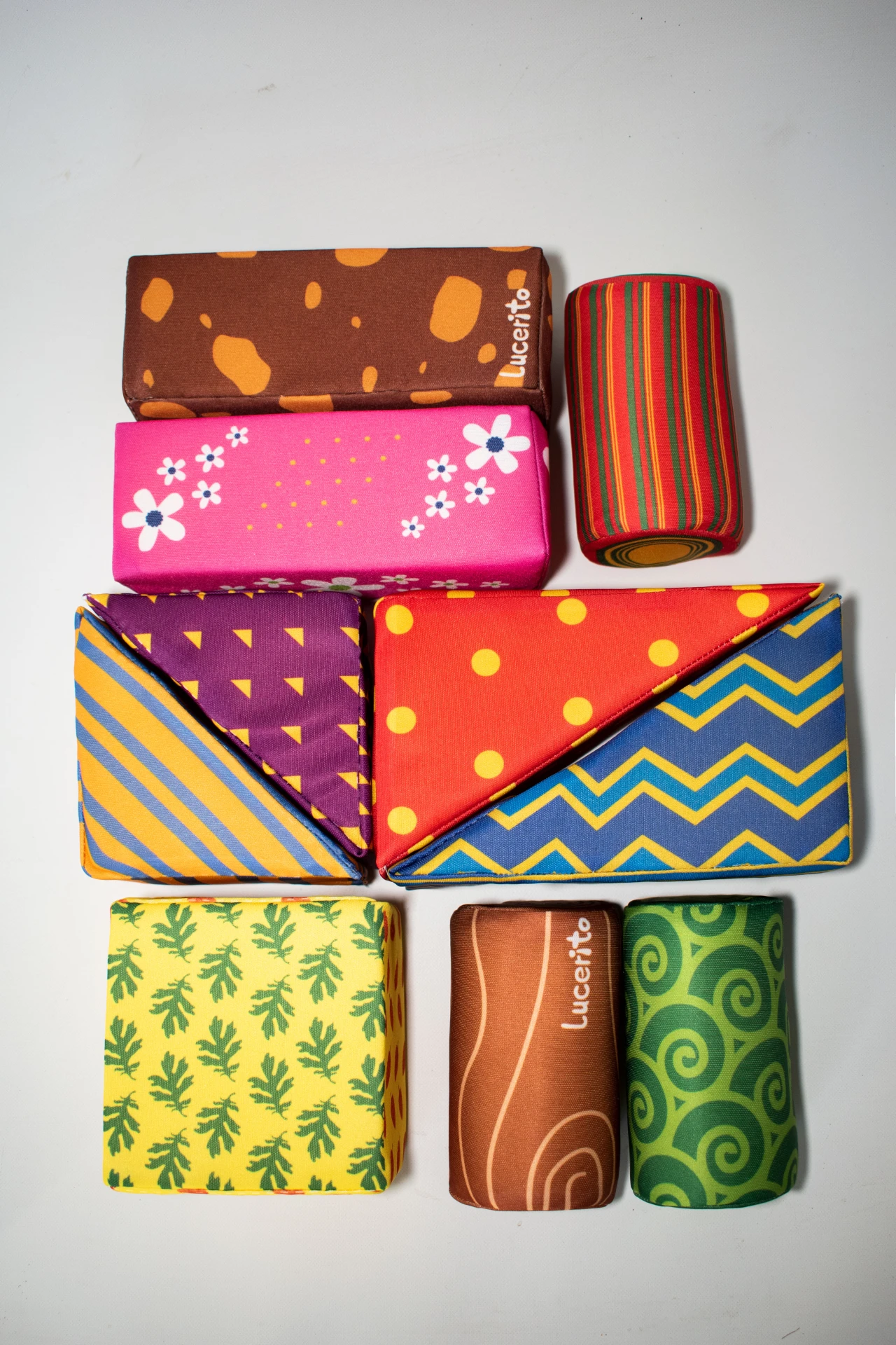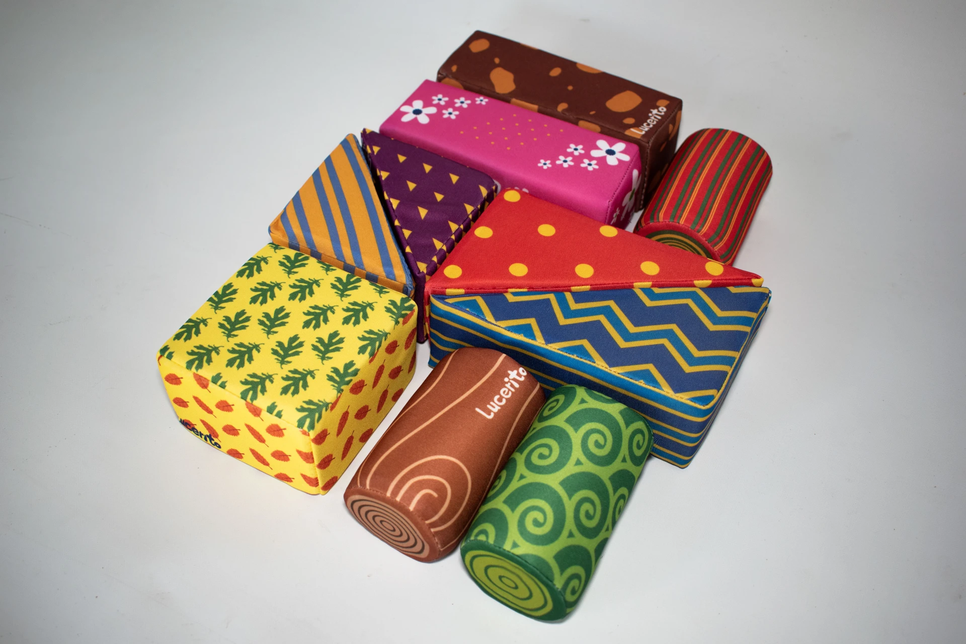 Set de 10 formas geométricas formado por 3 Cilindros de 8x6 de diámetro, 2 prismas de 12x6 cmts., 2 cuñas de 12x8 cmts., 2 triángulos de 8x6 cmts y un rectángulo de 12x6.